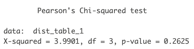 The Chi-square test resulted in a p-value of 0.2625, indicating that there is a 26% likelihood that the differences in these two distributions are due to randomness. Thus, there is not likely a statistically significant difference in distribution between donations from Maine and donations from outside of Maine.