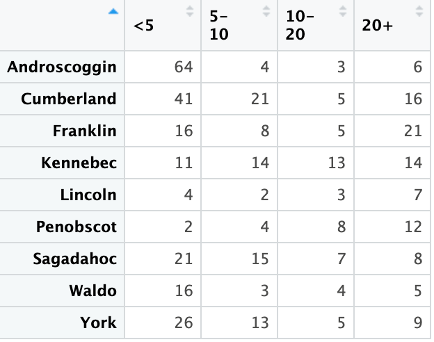 colnames(dist_table) <- c("<5", "5-10", "10-20", "20+")