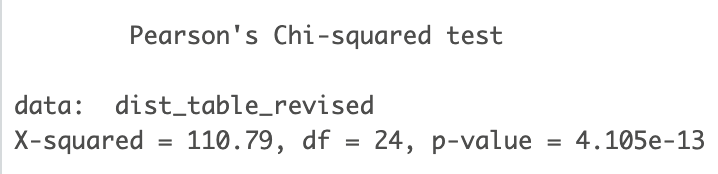 This Chi-squared test produced a very small p-value, indicating that there is very little chance that the differences in donation distribution between counties is due to random variation.