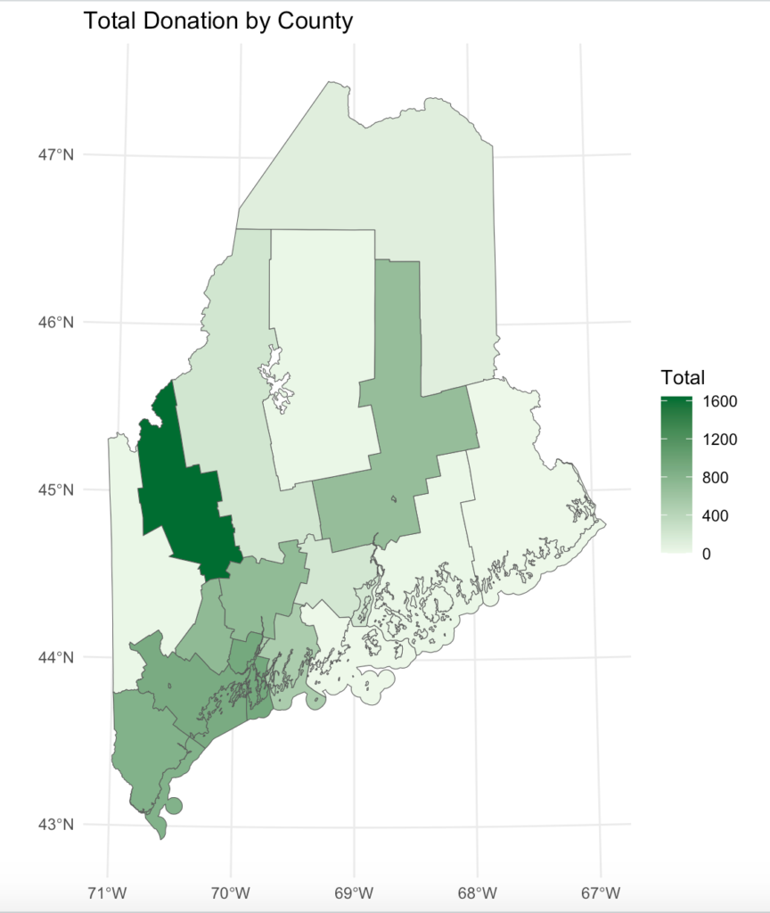 Using the data frame county_data_merged, the production of which is documented on the page Data Preparation, we can produce a map in which each county is shaded according to its total donation amount to the Maine State Seminary.