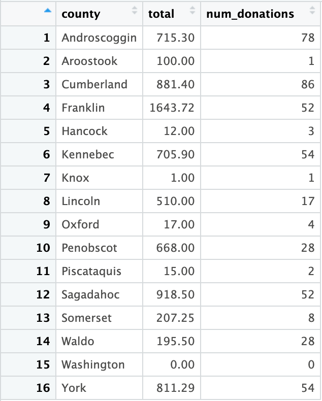 But what about within Maine? The Chi-squared test can be repeated, this time grouping the donations by county.