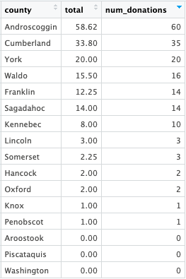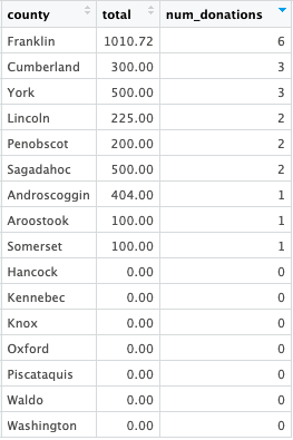 Interestingly, Franklin county does not have the highest number of individual donations. Cumberland and Androscoggin counties had far more donations, but still had lower totals than Franklin. This indicates that Franklin county must have contributed relatively fewer, but larger donations. In fact, six of the 22 donations of $100 or higher came from Franklin county. In contrast, Androscoggin had the highest share of donations of $1 or less.